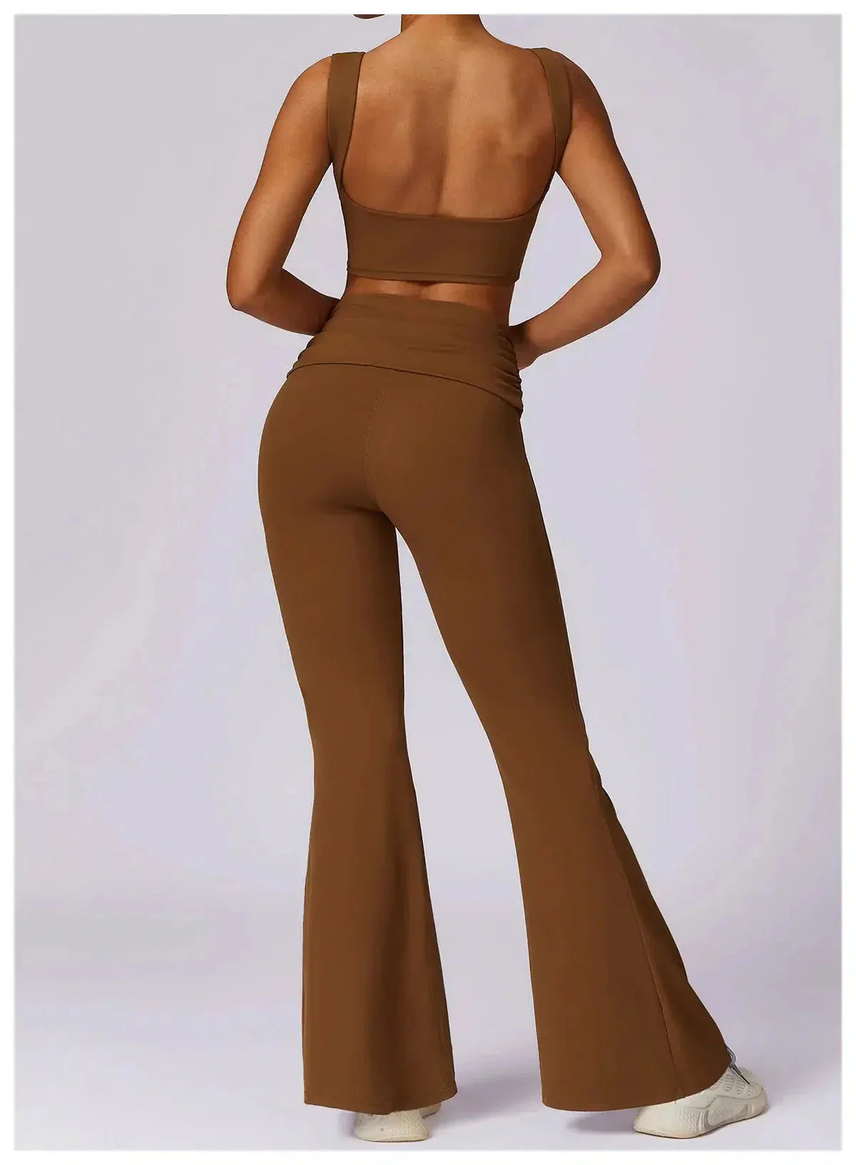 Upgrade your fitness wardrobe with the Renata Feminine Flared Gym Set, where style meets ultimate comfort. This chic set features a high-waisted flared training pant that flatters your figure, paired with a supportive tank top with built-in padding for extra confidence.